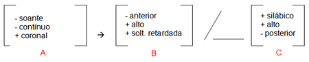 Tanto na representação estruturalista quanto na gerativista, o elemento A (anterior à seta) corresponde à descrição natural, o elemento B (posterior à seta) corresponde à mudança estrutural, e o elemento C corresponde ao ambiente em que tal mudança ocorre. É importante lembrar, que na representação gerativista não há necessidade de no elemento A aparecer os traços que serão modificados em B. Por exemplo, no caso acima, se em B ocorre o traço anterior, não há necessidade de citar o traço + anterior em A.